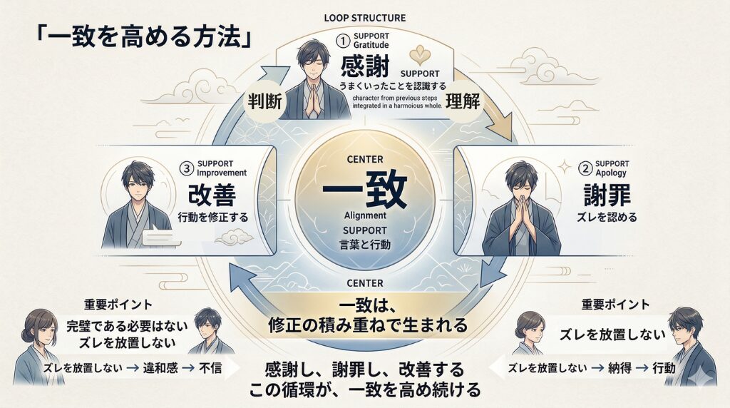 この繰り返しが、言葉と行動のズレを修正していきます。